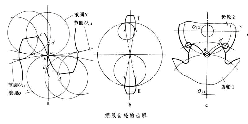 由一對(duì)擺線齒輪組成的齒輪傳動(dòng)。擺線齒輪的齒廓由內(nèi)擺線或外擺線組成(圖中a[擺線齒輪的齒廓] )。滾圓S在節(jié)圓O外面滾動(dòng)形成齒頂曲線bc,在節(jié)圓O內(nèi)面滾動(dòng)形成齒根曲線aa;同樣,滾圓Q在O內(nèi)面滾動(dòng)形成齒根曲線bb,在O外面滾動(dòng)形成齒頂曲線ad。這樣的輪齒接觸傳動(dòng)相當(dāng)于一對(duì)大小為O和O的摩擦輪互相滾動(dòng)。擺線齒輪傳動(dòng)大多用于鐘表和某些儀器,與一般齒輪傳動(dòng)相比,它的特點(diǎn)是:①傳動(dòng)時(shí)一對(duì)齒廓中凹的內(nèi)擺線與凸的外擺線嚙合,因而接觸應(yīng)力小,磨損均勻;②齒廓的重合度較大,有利于彎曲強(qiáng)度的改善;③無(wú)根切現(xiàn)象,最少齒數(shù)不受限制,故結(jié)構(gòu)緊湊,也可得到較大的傳動(dòng)比;④對(duì)嚙合齒輪的中心距要求較高,若不能保證輪齒正確嚙合,會(huì)影響定傳動(dòng)比傳動(dòng);⑤這種傳動(dòng)的嚙合線是圓弧的一部分,嚙合角是變化的,故輪齒承受的是交變作用力,影響傳動(dòng)平穩(wěn)性;⑥擺線齒輪的制造精度要求較高。 擺線齒輪傳動(dòng)分內(nèi)外嚙合和齒條嚙合兩種。齒條的齒頂和齒根都是滾圓在直線上滾成的擺線。這種傳動(dòng)還有一些變形齒廓(圖中b[擺線齒輪的齒廓] )。 滾圓尺寸對(duì)齒根曲線有影響。齒廓Ⅰ的滾圓小,齒根部?jī)蓚?cè)曲線外伸;齒廓Ⅱ的滾圓直徑恰等于節(jié)圓半徑,內(nèi)擺線變成一條節(jié)圓的半徑線。如果再用圓弧代替齒頂?shù)耐鈹[線,輪齒即變成圓和直線的組合,加工就很方便,可用成形銑刀銑削或用沖壓等方法制造。針輪傳動(dòng)(圖中c[擺線齒輪的齒廓] )的節(jié)圓O同時(shí)作為齒輪1的滾圓,另一滾圓半徑為零。當(dāng)O在O上滾動(dòng)時(shí),圓周上一點(diǎn)a在齒輪1上畫外擺線,但由于輪齒要傳遞運(yùn)動(dòng)和力,a點(diǎn)要用圓銷來(lái)代替。這時(shí)aa只是齒輪1的理論齒廓,它的實(shí)際齒廓是圓銷中心在aa上運(yùn)動(dòng)時(shí)所形成的一條等距曲線。如果節(jié)圓O的半徑變?yōu)闊o(wú)窮大,針輪變?yōu)閹в袌A柱輪齒的齒條,這時(shí)齒輪1的齒廓便變?yōu)闈u開(kāi)線。